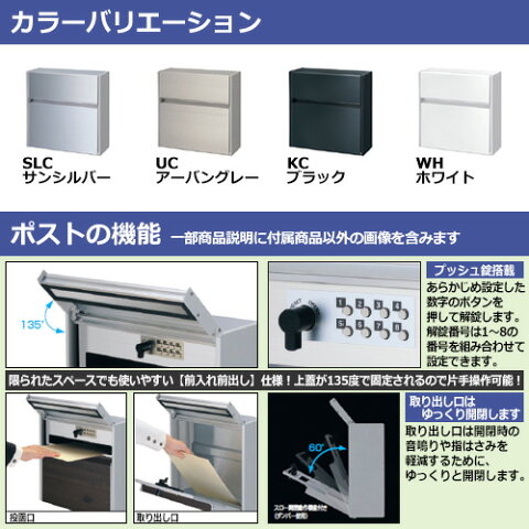 ■ SWE-1型ポストの人気のヒミツ! 壁付けポスト SWE型ポストのポイント! Point1. 扉がゆっくり開くため、安全でバタンッと大きな音もしません! Point2. フタも一定の位置で固定ができるから片手でもらくらく操作できる! Point3. 前面部だけで全ての操作ができる壁付けタイプだから限られた敷地内での使用にも適しています! Point4. 防犯性の高いプッシュ錠を搭載しているから安心! ※1〜8のボタンをお好きなボタン1つ以上設定し使用できます。