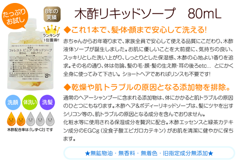 木酢スキンケアで健康的なお肌に! 洗顔石けん、ボディーソープ(泡ポンプもOK)、ノンシリコンシャンプーなど、敏感なお身体の洗浄に。